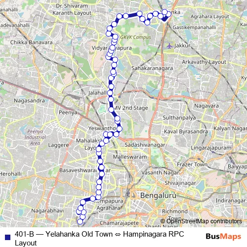 The first stop of the 401-B bus route is Hampinagara RPC Layout and the last stop is Yelahanka Old Town. 401-B (Yelahanka Old Town ⇔ Hampinagara RPC Layout) is operational during everyday.