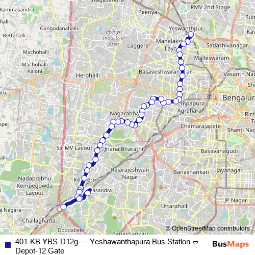 The first stop of the 401-KB YBS-D12g bus route is Yeshawanthapura Bus Station and the last stop is