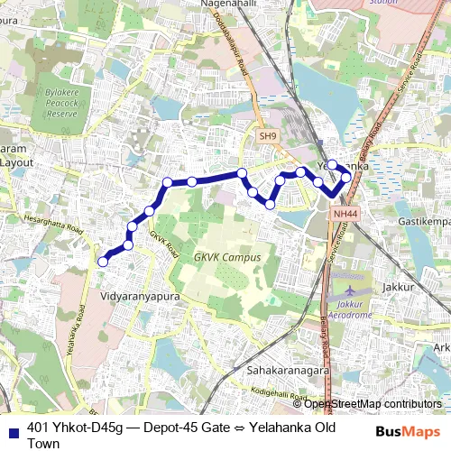 Depot-45 Gate. 401 Yhkot-D45g (Depot-45 Gate ⇔ Yelahanka Old Town) is operational during everyday.