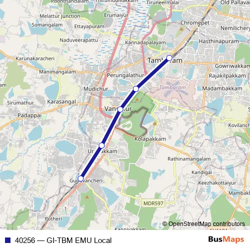 The first stop of the 40256 rail route is Guduvancheri and the last stop is Tambaram. 40256 (GI-TBM EMU Local) is operational during everyday.
