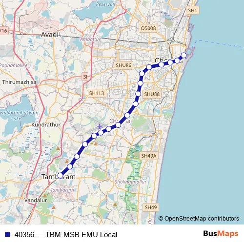 The first stop of the 40356 rail route is Tambaram and the last stop is Chennai Beach. 40356 (TBM-MSB EMU Local) is operational during everyday.