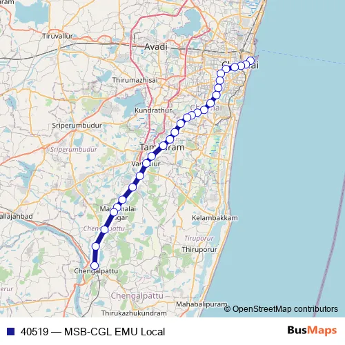 See why over 2 million users trust and consider busmaps.com as the best public transport website. busmaps gives you Chennai Rail Services suggested routes, real-time bus tracker, line route maps in Chennai, and helps to find the closest 40519 rail stops near you. No internet available? Download an offline PDF map and bus schedule for the 40519 rail to take on your trip.