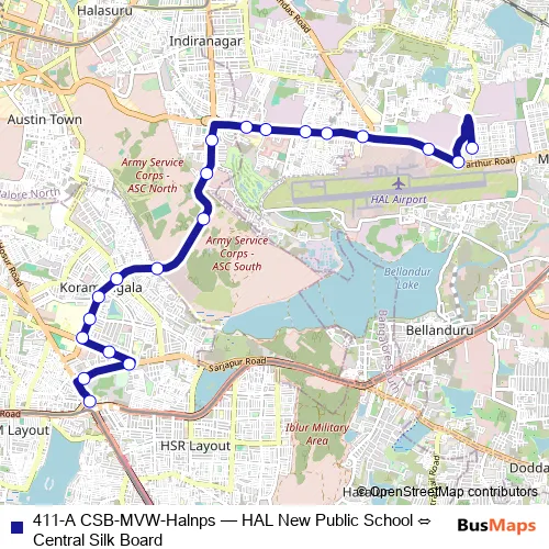 The first stop of the 411-A CSB-MVW-Halnps bus route is HAL New Public School and the last stop is Central Silk Board. 411-A CSB-MVW-Halnps (HAL New Public School ⇔ Central Silk Board) is operational during everyday.
