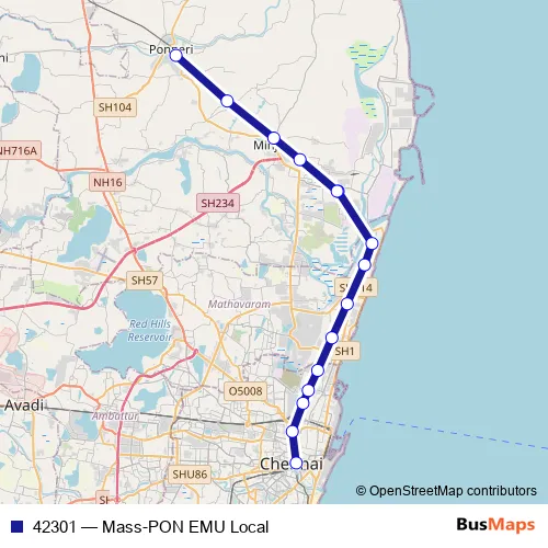 The first stop of the 42301 rail route is Chennai Central Suburban Station and the last stop is Ponneri. 42301 (Mass-PON EMU Local) is operational during everyday.
