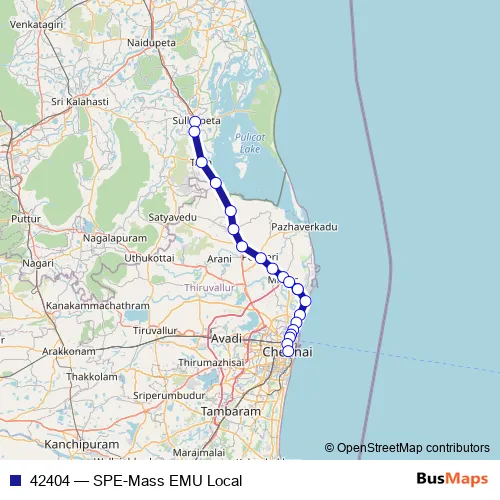 The first stop of the 42404 rail route is Sullurupeta and the last stop is Chennai Central Suburban Station. 42404 (SPE-Mass EMU Local) is operational during everyday.