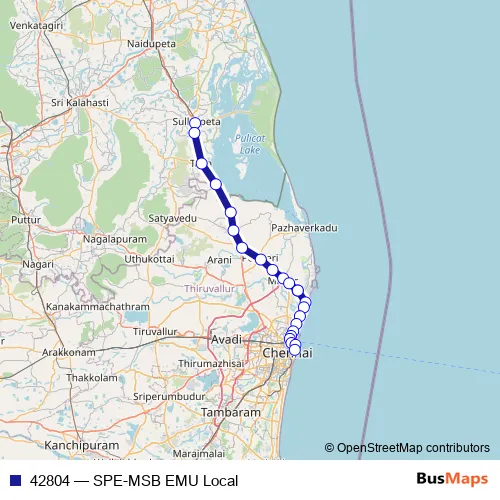 The first stop of the 42804 rail route is Sullurupeta and the last stop is Chennai Beach. 42804 (SPE-MSB EMU Local) is operational during everyday.