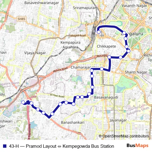 The first stop of the 43-H bus route is Kempegowda Bus Station and the last stop is Pramod Layout. 43-H (Pramod Layout ⇔ Kempegowda Bus Station) is operational during everyday.