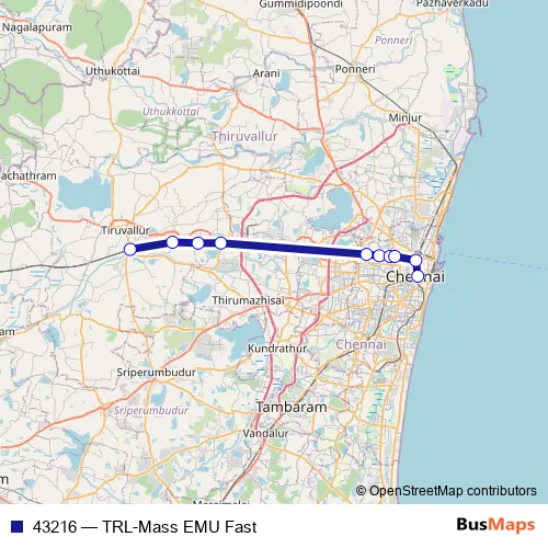 The first stop of the 43216 rail route is Tiruvallur and the last stop is Chennai Central Suburban Station. 43216 (TRL-Mass EMU Fast) is operational during everyday.