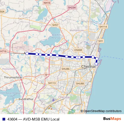 The first stop of the 43604 rail route is Avadi and the last stop is Chennai Beach. 43604 (AVD-MSB EMU Local) is operational during everyday.