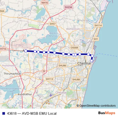 The first stop of the 43618 rail route is Avadi and the last stop is Chennai Beach. 43618 (AVD-MSB EMU Local) is operational during everyday.