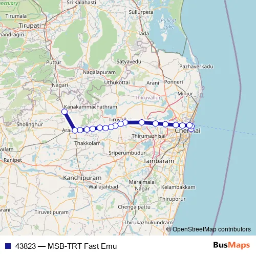 The first stop of the 43823 rail route is Chennai Beach and the last stop is Tiruttani. 43823 (MSB-TRT Fast Emu) is operational during everyday.