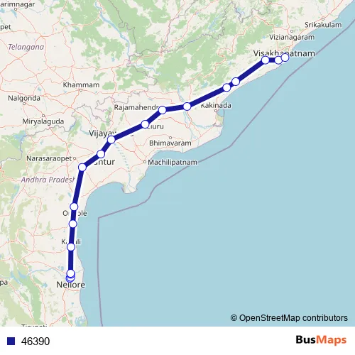 The first stop of the 46390 bus route is Nellore and the last stop is