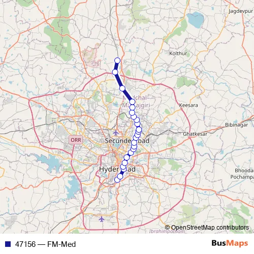 The first stop of the 47156 rail route is Falaknuma and the last stop is Medchal. 47156 (FM-Med) is operational during everyday.