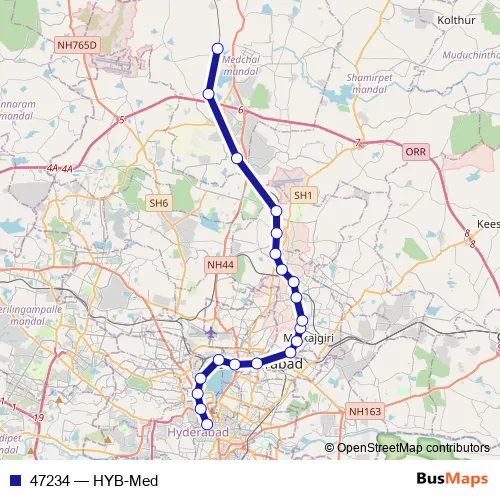 The first stop of the 47234 rail route is Hyderabad and the last stop is Medchal. 47234 (HYB-Med) is operational during everyday.