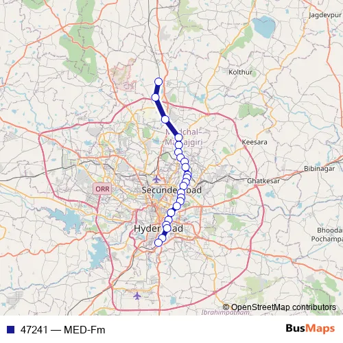 The first stop of the 47241 rail route is Medchal and the last stop is Falaknuma. 47241 (MED-Fm) is operational during everyday.