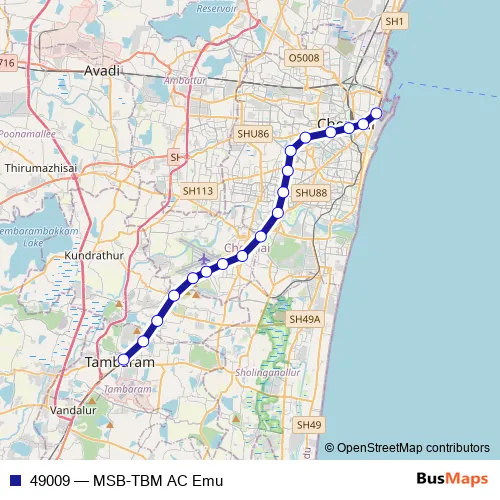 The first stop of the 49009 rail route is Chennai Beach and the last stop is Tambaram. 49009 (MSB-TBM AC Emu) is operational during everyday.