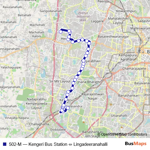 The first stop of the 502-M bus route is Kengeri Bus Station and the last stop is Lingadeeranahalli. 502-M (Kengeri Bus Station ⇔ Lingadeeranahalli) is operational during everyday.