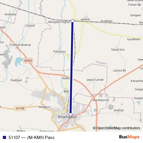 The first stop of the 51107 rail route is Jalamb Jn. and the last stop is Khamgaon. 51107 (JM-KMN Pass) is operational during everyday.