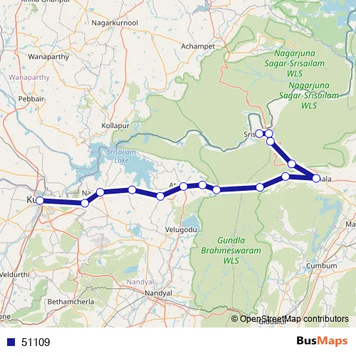 The first stop of the 51109 bus route is Srisailam and the last stop is