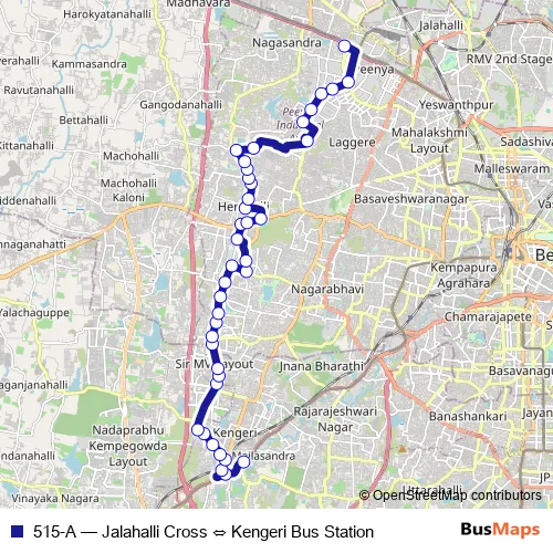 The first stop of the 515-A bus route is Kengeri Bus Station and the last stop is Jalahalli Cross. 515-A (Jalahalli Cross ⇔ Kengeri Bus Station) is operational during everyday.