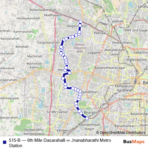 The first stop of the 515-B bus route is Jnanabharathi Metro Station and the last stop is 8th Mile Dasarahalli. 515-B (8th Mile Dasarahalli ⇔ Jnanabharathi Metro Station) is operational during everyday.