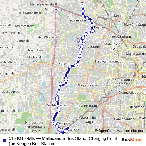 The first stop of the 515 KGR-Mls bus route is Mallasandra Bus Stand (Charging Point) and the last stop is Kengeri Bus Station. 515 KGR-Mls (Mallasandra Bus Stand (Charging Point) ⇔ Kengeri Bus Station) is operational during everyday.