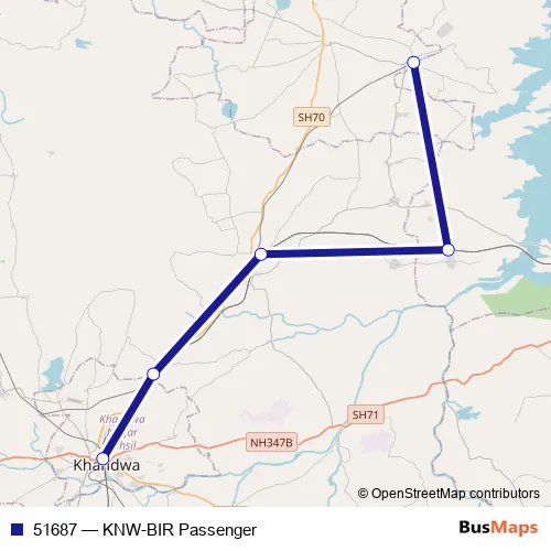 The first stop of the 51687 rail route is Khandwa Junction and the last stop is Bir. 51687 (KNW-BIR Passenger) is operational during everyday.