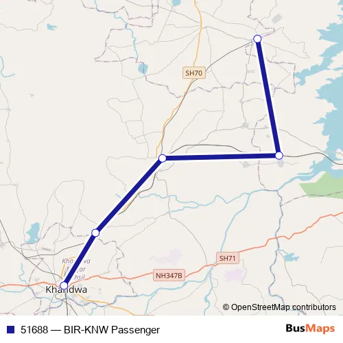 The first stop of the 51688 rail route is Bir and the last stop is Khandwa Junction. 51688 (BIR-KNW Passenger) is operational during everyday.