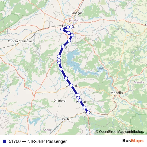 The first stop of the 51706 rail route is Nainpur Jn and the last stop is Jabalpur. 51706 (NIR-JBP Passenger) is operational during everyday.