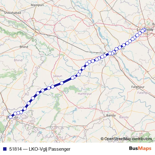 The first stop of the 51814 rail route is Lucknow Jn. and the last stop is Virangana Lakshmibai Jhansi Jn. 51814 (LKO-Vglj Passenger) is operational during everyday.