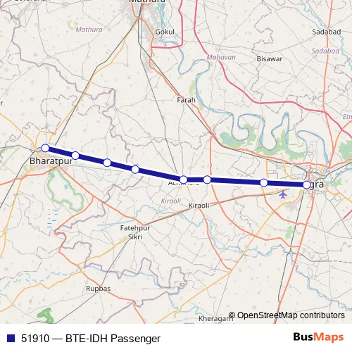 The first stop of the 51910 rail route is Bharatpur Jn and the last stop is Idgah Jn. 51910 (BTE-IDH Passenger) is operational during everyday.