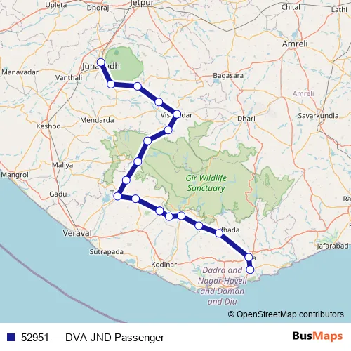 The first stop of the 52951 rail route is Delvada and the last stop is Junagadh Jn. 52951 (DVA-JND Passenger) is operational during everyday.
