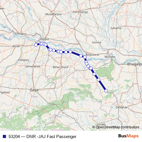The first stop of the 53204 rail route is Danapur and the last stop is Jhajha. 53204 (DNR -JAJ Fast Passenger) is operational during everyday.