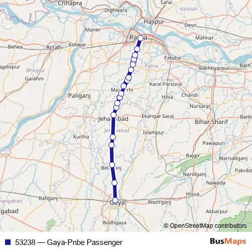 The first stop of the 53238 rail route is Gaya Jn and the last stop is Patna Jn. 53238 (Gaya-Pnbe Passenger) is operational during everyday.