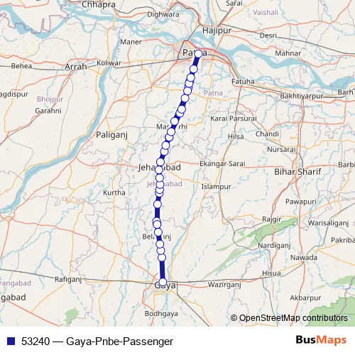 The first stop of the 53240 rail route is Gaya Jn and the last stop is Patna Jn. 53240 (Gaya-Pnbe-Passenger) is operational during everyday.