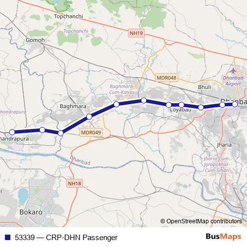 The first stop of the 53339 rail route is Chandrapura and the last stop is Dhanbad Jn. 53339 (CRP-DHN Passenger) is operational during everyday.