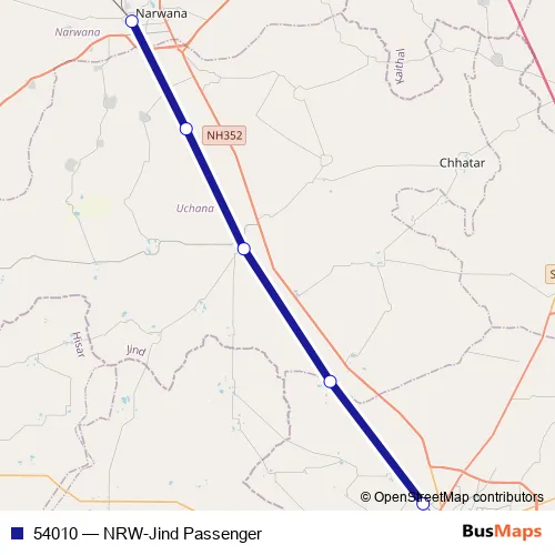 The first stop of the 54010 rail route is Narwana Jn and the last stop is Jind Jn. 54010 (NRW-Jind Passenger) is operational during everyday.