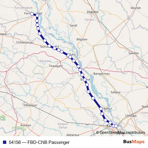The first stop of the 54156 rail route is Farrukhabad and the last stop is Kanpur Central. 54156 (FBD-CNB Passenger) is operational during everyday.
