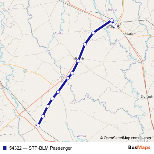 The first stop of the 54322 rail route is Sitapur Jn. and the last stop is Balamu Jn. 54322 (STP-BLM Passenger) is operational during everyday.