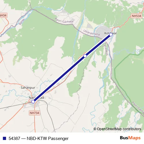 The first stop of the 54387 rail route is Najibabad Jn and the last stop is Kotdwara. 54387 (NBD-KTW Passenger) is operational during everyday.