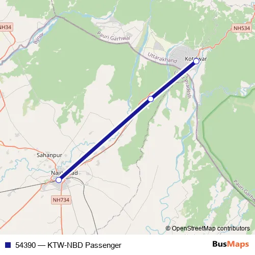 The first stop of the 54390 rail route is Kotdwara and the last stop is Najibabad Jn. 54390 (KTW-NBD Passenger) is operational during everyday.