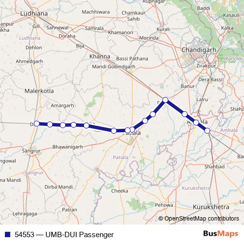 The first stop of the 54553 rail route is Ambala Cant Jn and the last stop is Dhuri Jn. 54553 (UMB-DUI Passenger) is operational during everyday.