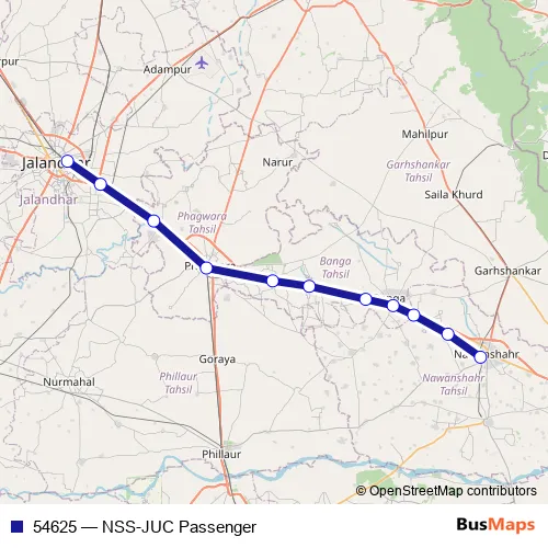 The first stop of the 54625 rail route is N S Doaba Jn and the last stop is Jalandhar City. 54625 (NSS-JUC Passenger) is operational during everyday.