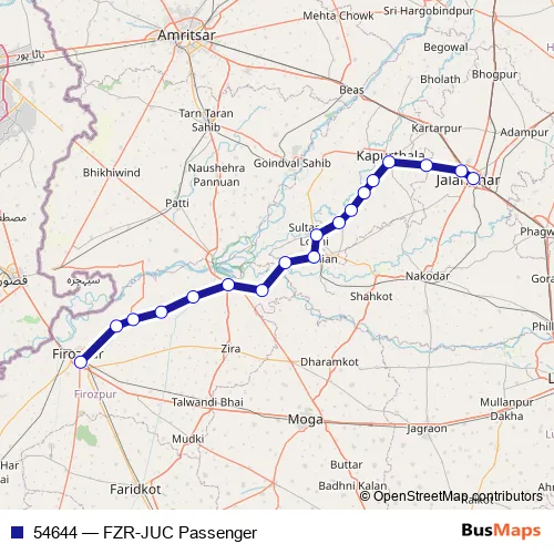 The first stop of the 54644 rail route is Firozpur Cant and the last stop is Jalandhar City. 54644 (FZR-JUC Passenger) is operational during everyday.