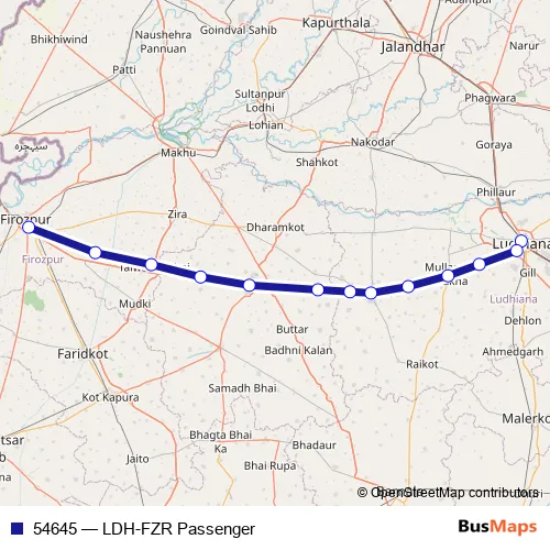 The first stop of the 54645 rail route is Ludhiana Jn and the last stop is Firozpur Cant. 54645 (LDH-FZR Passenger) is operational during everyday.