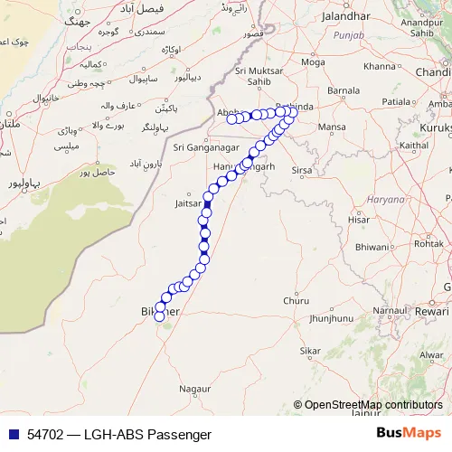 The first stop of the 54702 rail route is Lalgarh Jn and the last stop is Abohar. 54702 (LGH-ABS Passenger) is operational during everyday.