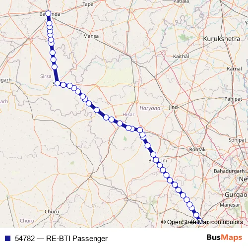 The first stop of the 54782 rail route is Rewari Jn. and the last stop is Bathinda. 54782 (RE-BTI Passenger) is operational during everyday.