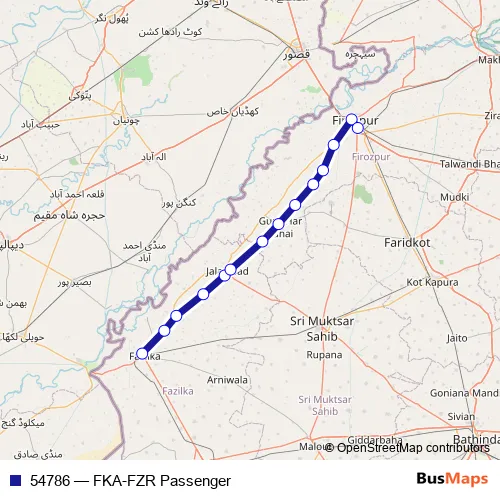 The first stop of the 54786 rail route is Fazilka and the last stop is Firozpur Cant. 54786 (FKA-FZR Passenger) is operational during everyday.