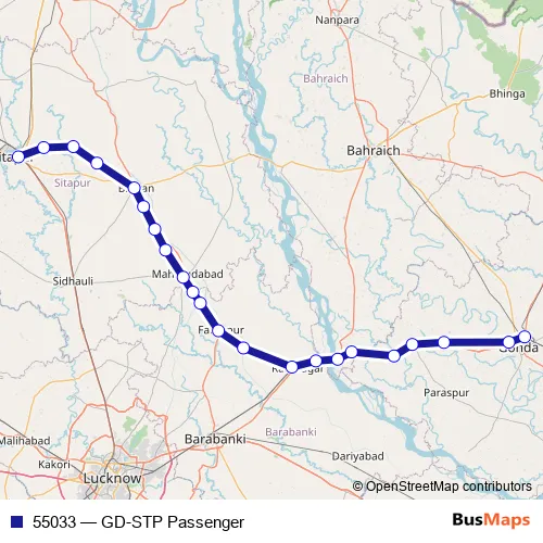 The first stop of the 55033 rail route is Gonda Jn and the last stop is Sitapur Jn.. 55033 (GD-STP Passenger) is operational during everyday.