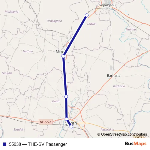 The first stop of the 55038 rail route is Thawe Jn and the last stop is Siwan Jn. 55038 (THE-SV Passenger) is operational during everyday.
